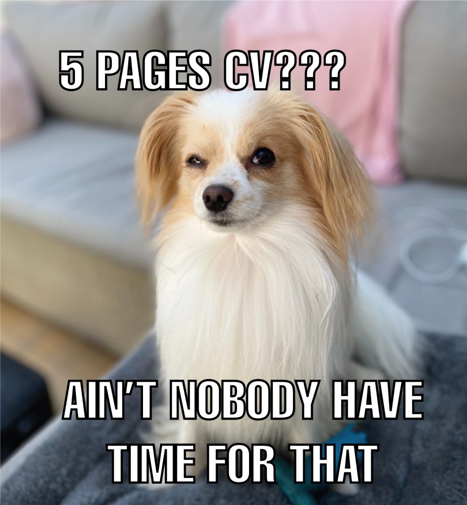 • The length of the CV is determined by the content; however, it should be kept between one and three full pages, and leaving it 1½ pages is not seen as professional.
